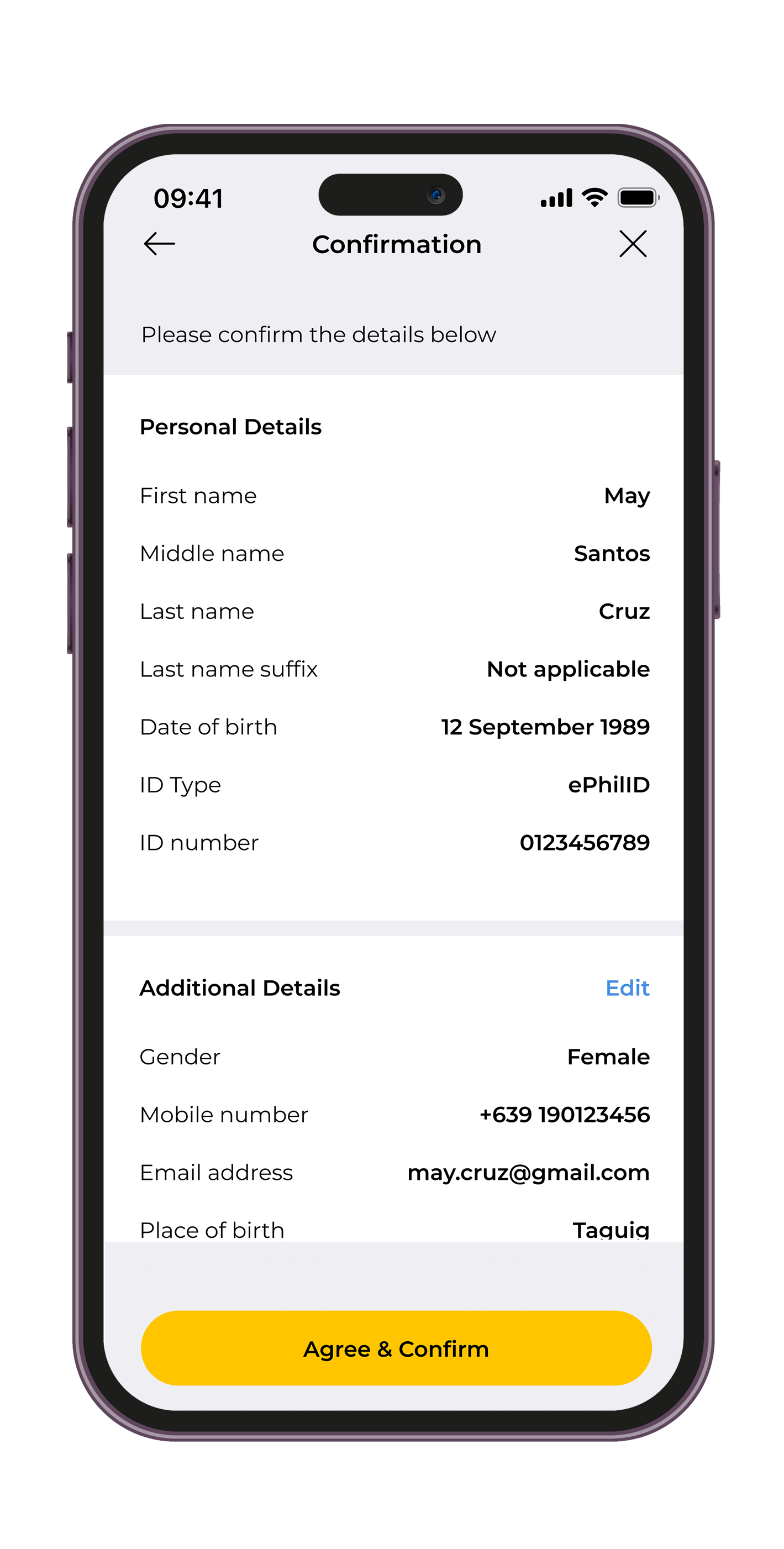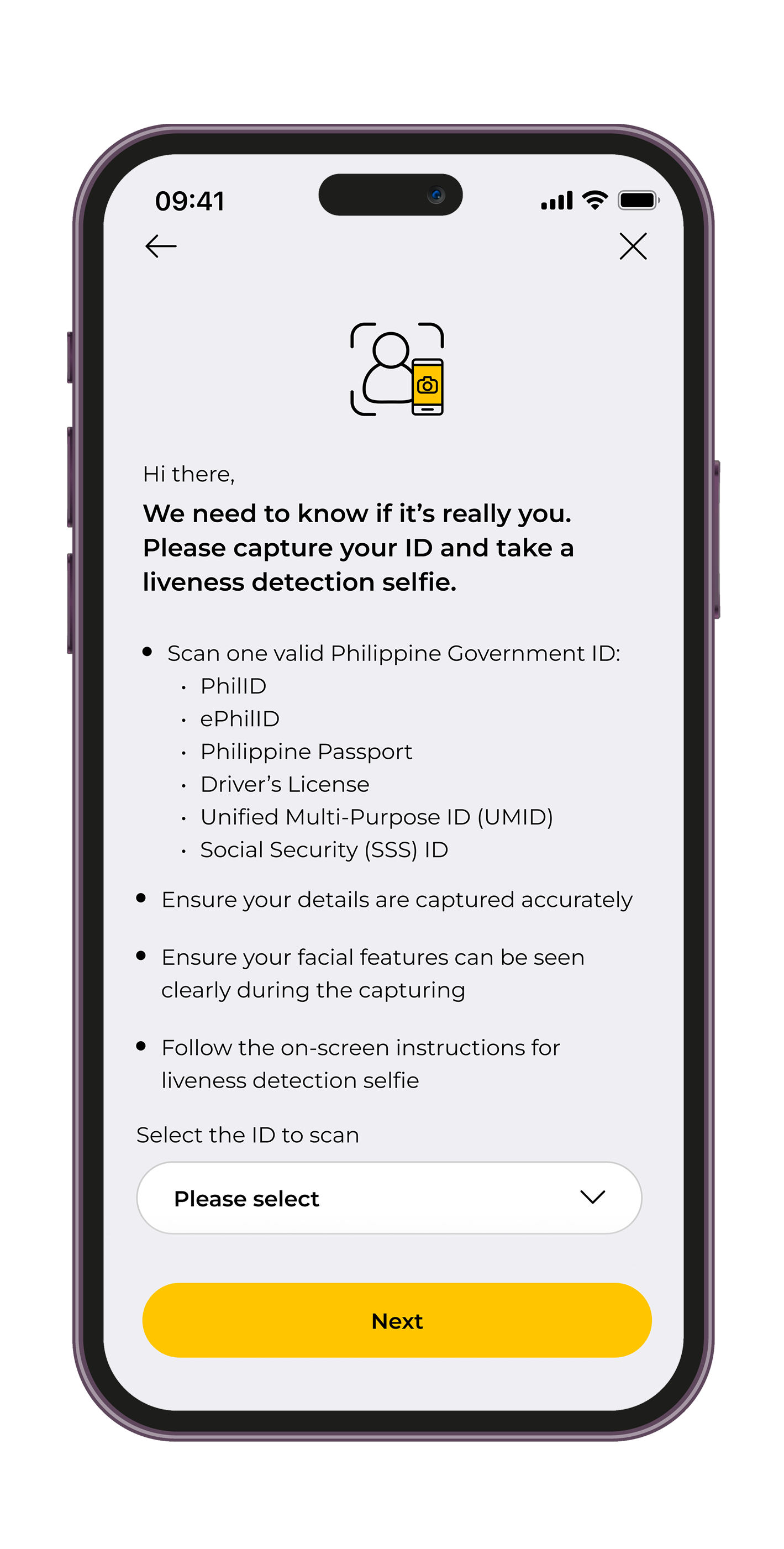 Take a photo of your valid and eligible Philippine Government ID and take a liveness detection selfie to verify your identity.