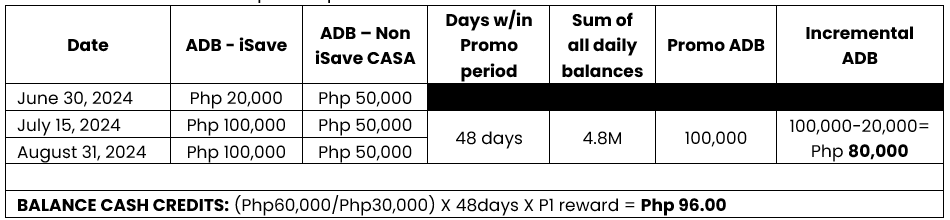 - If the customer’s incremental iSave ADB is more than Php300,000 but less than Php3,000,000, the customer will earn Php4.00 cash credit per day for every Php30,000 incremental ADB multiplied by the number of promo days.
